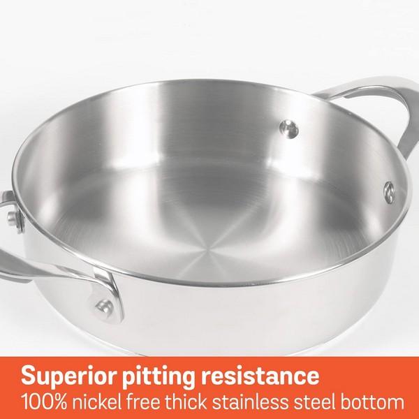- 100% Nickel Free Thick Stainless Steel Sauteuse Pan with Glass Lid; Metal utensil safe; Oven and Dishwasher safe