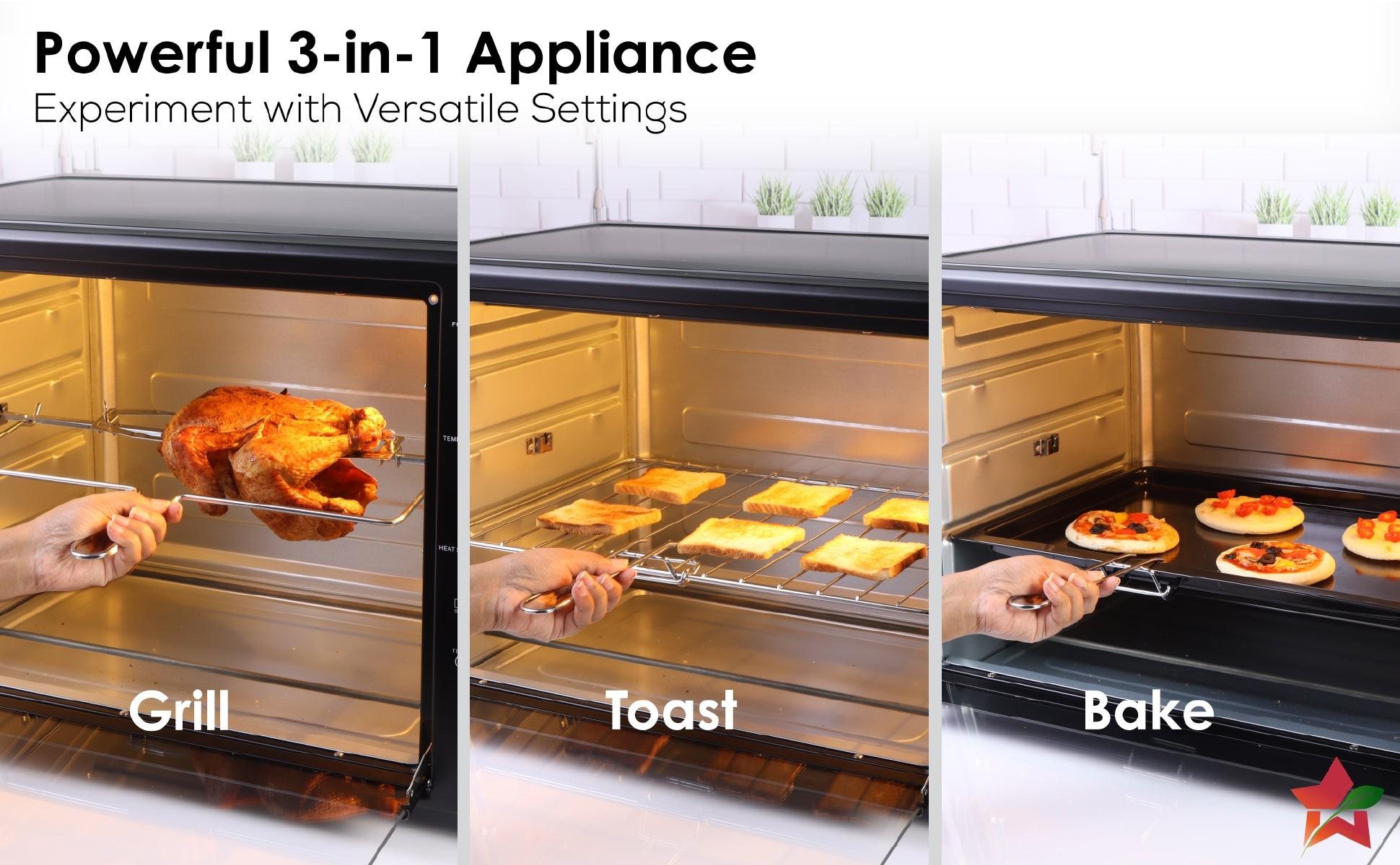 Bake delicious cakes, loaded pizzas, and the softest breads; roast chicken, grill vegetables and introduce a variety of new dishes in your kitchen conveniently Equipped with rotisserie function for cooking delicious tandoori dishes High-efficiency stainless steel heating elements help evenly toast, bake, brown and reheat to perfection