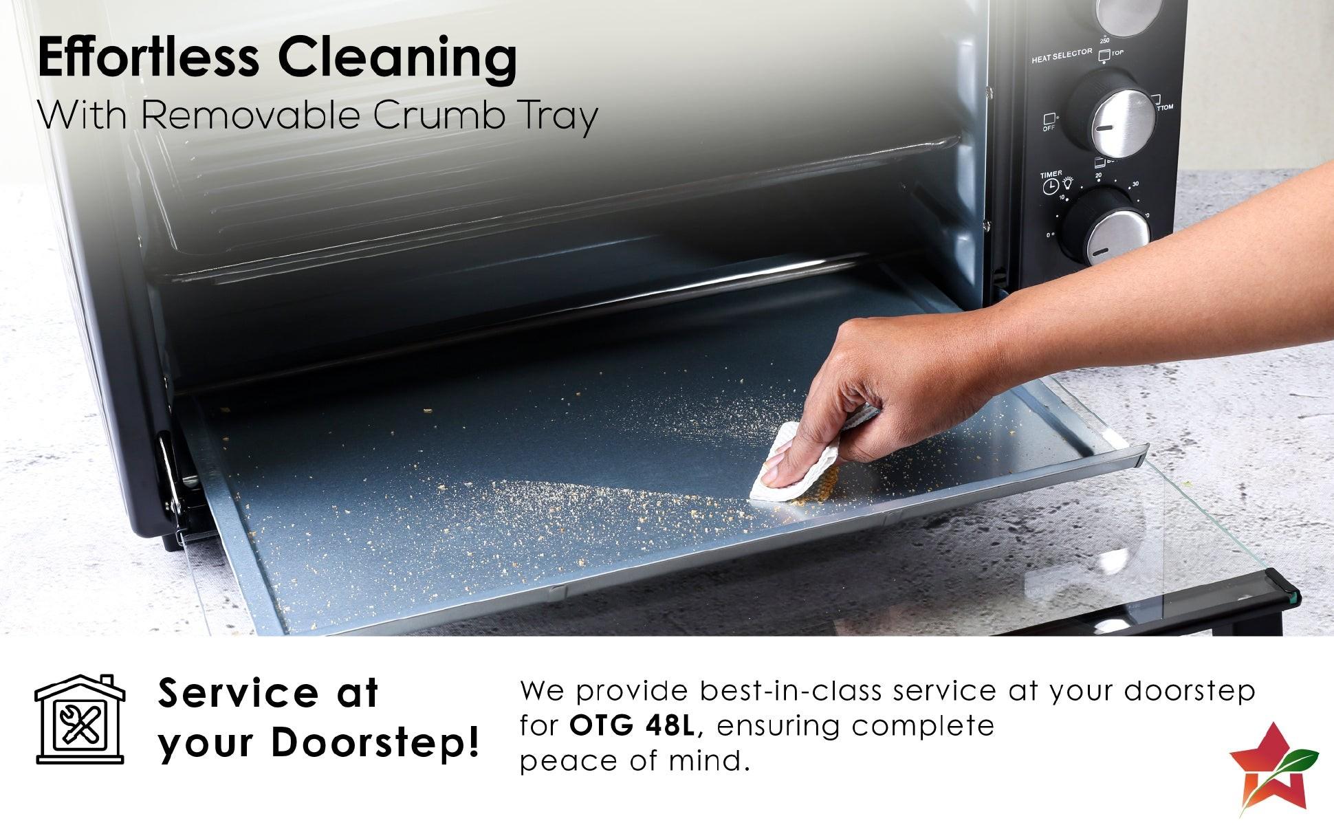 Auto-shut off timer function with ready bell to prevent over-cooking and under-cooking Heat-resistant tempered glass window can withstand high temperature & is safe to use Removable crumb tray for easy cleaning Inside lamp for clear visibility throughout the cooking process