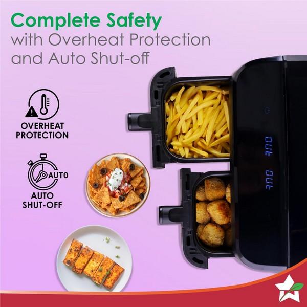 Cook healthy and crispy snacks with almost no oil. Simultaneously cook 2 different dishes in 2 separate baskets and 2 different ways. 8 Pre-set functions including baking, grilling, frying, roasting. Window and interior lights to help you monitor the cooking. Comes with digital display and 2 independent touch controls. 2000W | 9L