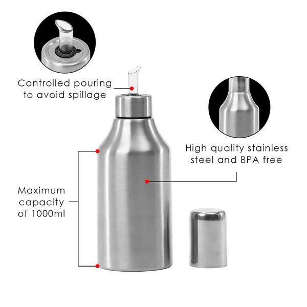 Controlled pouring spout to avoid spillage and oil trickle. Anti-drip design prevents oil leakage. With max capacity of 1000ml, it can be used for all kinds of oils, soy sauce, balsamic vinegar and more.