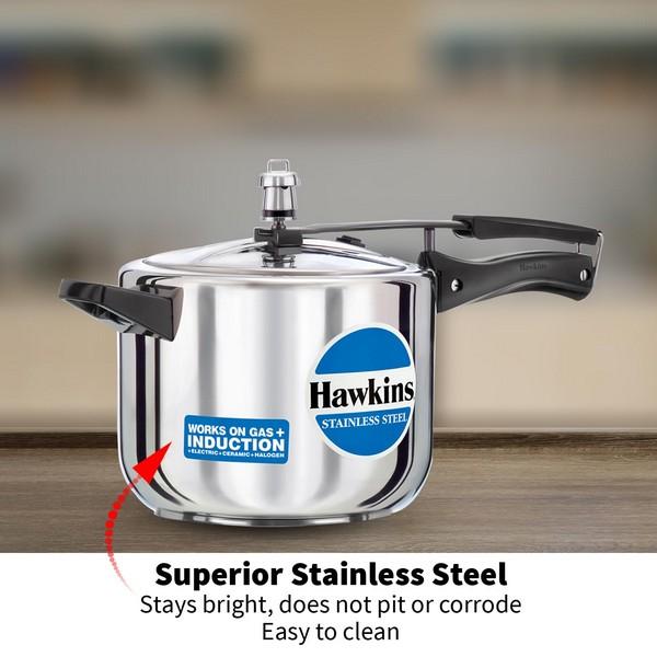 The pressure cooker body and lid are made of food-grade, superior stainless steel for maximum hygiene and durability. On the outside bottom of the pressure cooker, sandwiched between two sheets of stainless steel, The unique Hawkins pressure-locked safety lid ensures that when there is pressure inside the cooker, the lid is pressure-locked like a modern jetliner door. It cannot be opened until the pressure has fallen to a safe level.