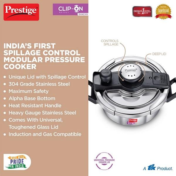 Use the unique glass lid to saute, steam, fry, boil, cook and even serve. The Prestige Clip-on Mini Svachh Pressure cooker range is modular in design, which means you can use the same lid on all utensils in the range.