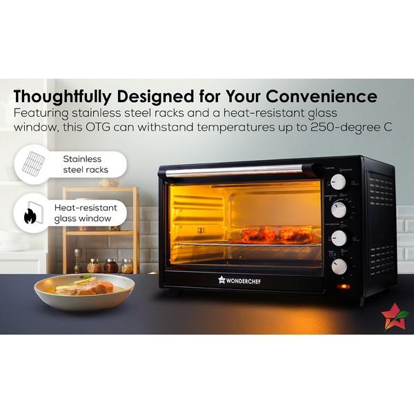 Includes OTG, Chromed wire rack, Baking and grilling tray and tray handle Capacity: 60 litres, Suitable for 4-6 people; Dimensions: 63*44*43 cm Power Consumption: 220-230V~50Hz~2000W; Warranty: 2 years Material: Stainless Steel; Heating Type: Grill + Convection and Control Type: Rotating Knob; Heating element selector: top, bottom, sides Wonderchef products are inspired by Italian Design and adhere to German Quality Standards.
