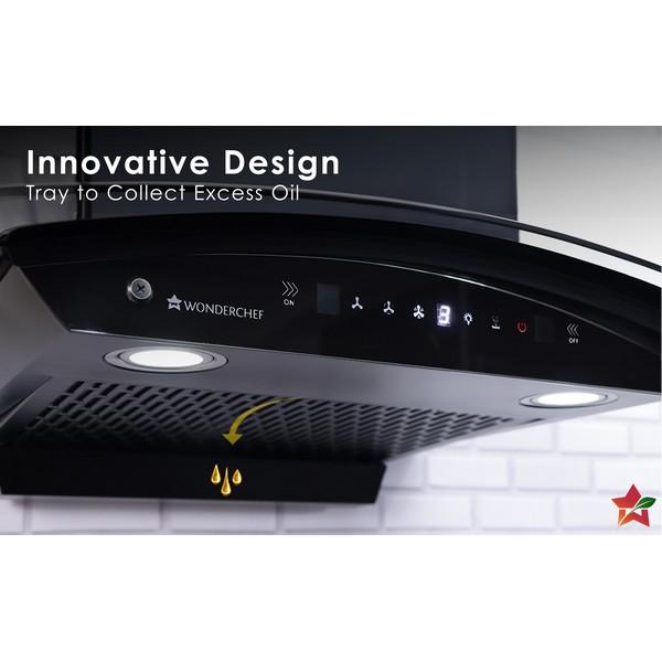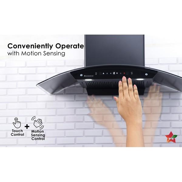 Classy and efficient low noise chimneys, with LED lights, powerful suction capacity of 1400 M 3 / h , gesture and touch control for speed and power, LED light, tempered glass, auto-clean technology.