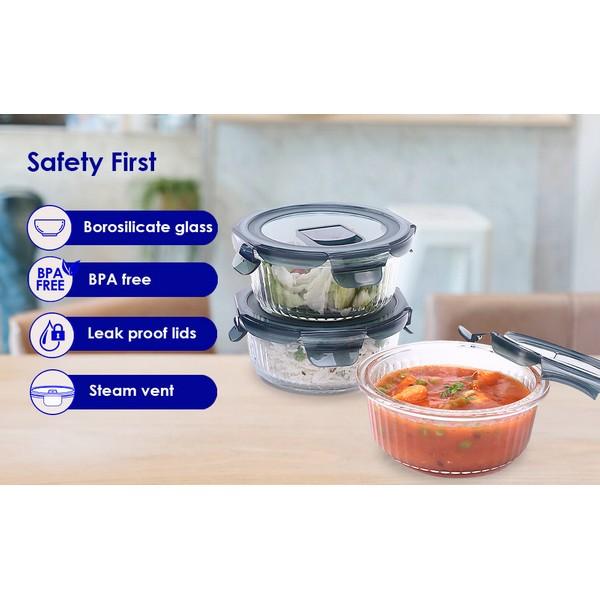 High quality 100% food safe borosilicate glass containers. Secure and leak-proof lids with silicon seal and secure locks. Steam vent in the lids to release vacuum.